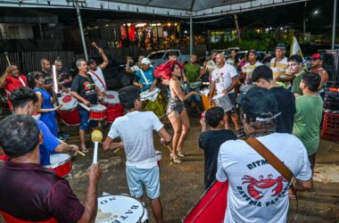 A bateria do bloco carnavalesco Sambase, se reuniu na noite desta sexta-feira (21), no bairro da Base, em Rio Branco, à beira do Rio Acre,