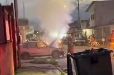 Um carro pegou fogo na manhã desta quinta-feira (13) no bairro Seis de Agosto, nas proximidades da sorveteria Zero Grau, no Segundo Distrito de Rio