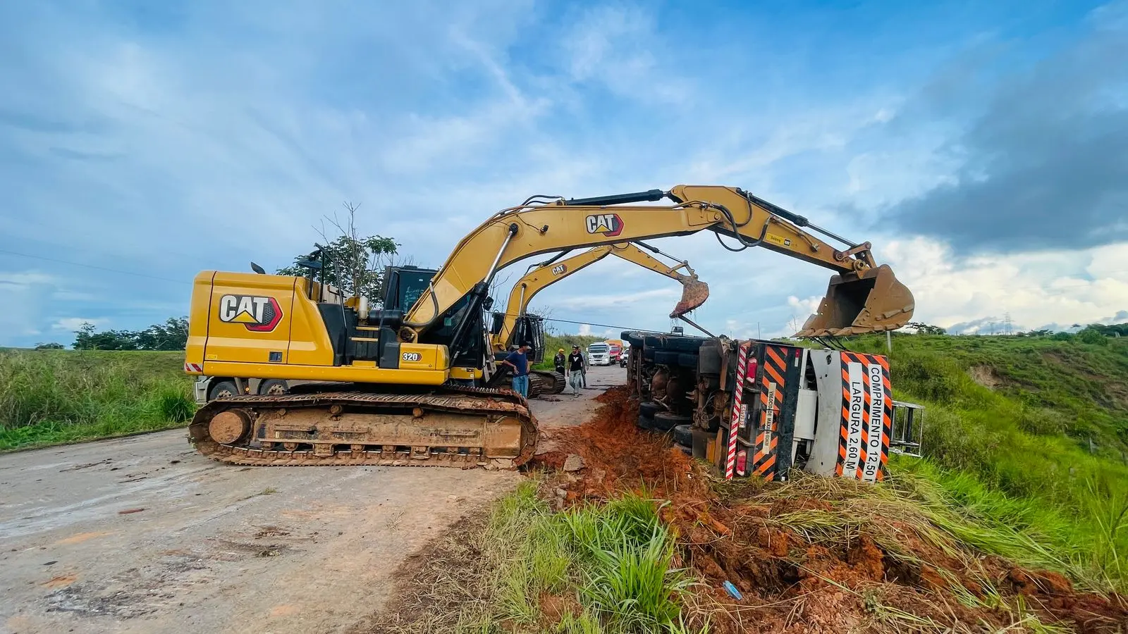 Segundo informações preliminares, dois tratores modelo PC320 e um caminhão guincho foram acionados para auxiliar na remoção do guindaste acidentado.