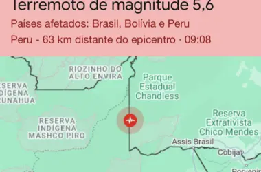Um terremoto de magnitude 5,6 atingiu a fronteira entre Brasil e Peru nesta terça-feira (11), segundo informou o Centro Alemão de Pesquisa em Geociências (GFZ).