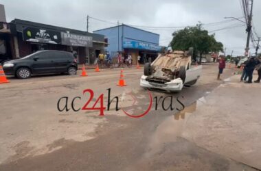 Uma colisão entre dois veículos deixou uma mulher ferida e causou o capotamento de um carro na manhã desta sexta-feira, 7, na Avenida Sobral, no