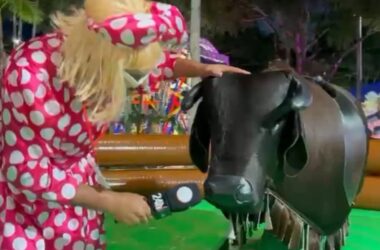 Uma das atrações que mais têm chamado a atenção na Praça da Revolução durante as noites de Carnaval é o touro mecânico. O brinquedo, que