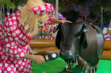 Uma das atrações que mais têm chamado a atenção na Praça da Revolução durante as noites de Carnaval é o touro mecânico. O brinquedo, que