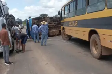 Um caminhão modelo 608 tombou nessa sexta-feira (21) após bater em um buraco no km 70 da BR-364, sentido Porto Velho, próximo à Vila Campinas,
