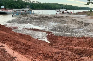 As máquinas do Deracre que estavam trabalhando para fazer o novo acesso da balsa que faz a travessia de veículos e pessoas no Rio Juruá