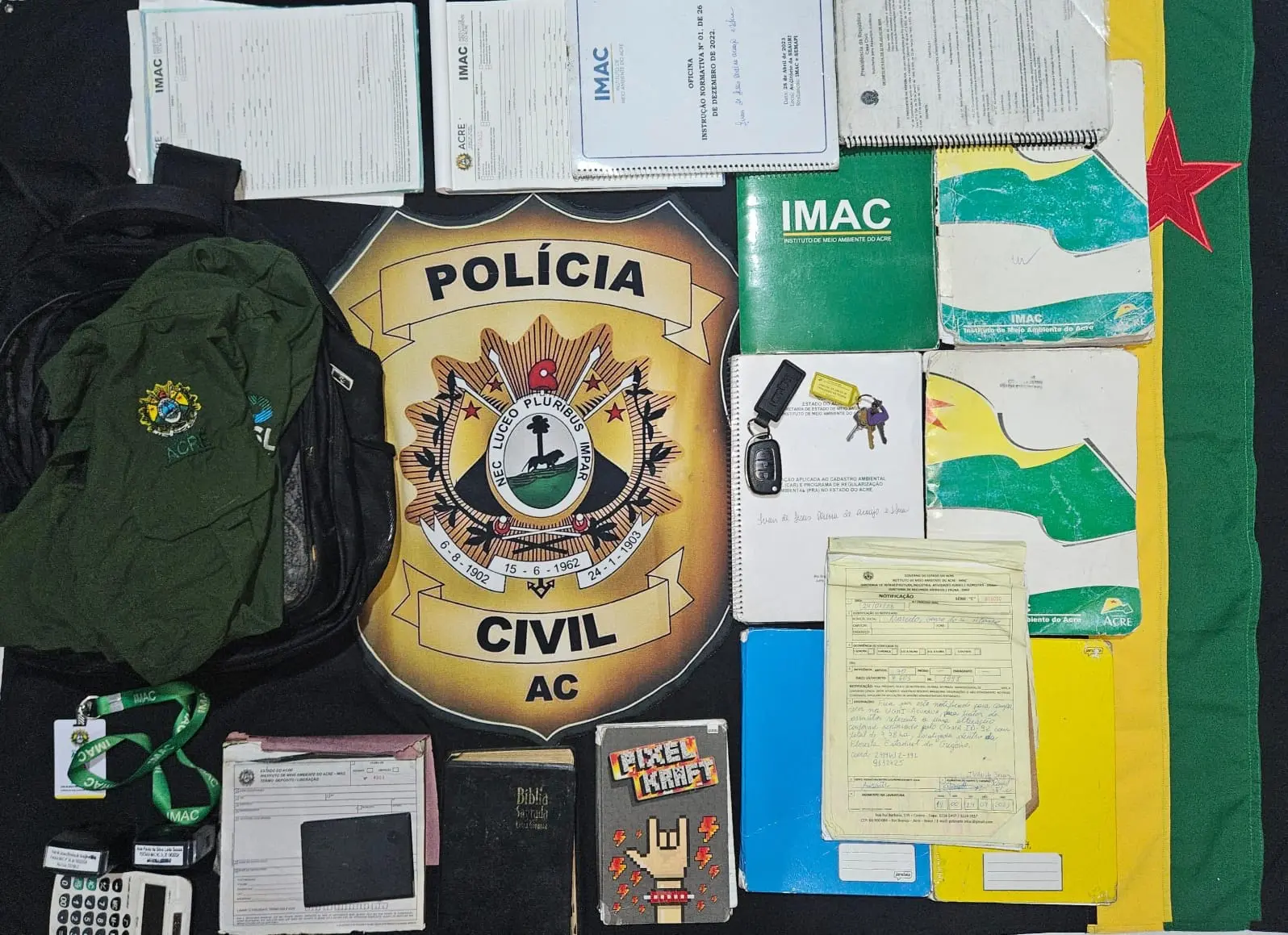 Na mochila haviam documentos públicos, roupas e outros itens do Imac, como carimbos de funcionários, vestimenta oficial do órgão, chave de um veículo e cadernos de anotações do Instituto.