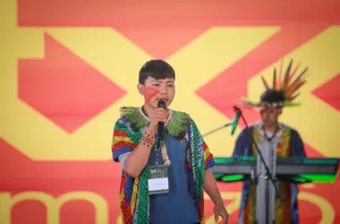 Durante a mostra cultural do seminário Txai Amazônia, que acontece nesta quarta-feira, 25, na Universidade Federal do Acre (Ufac), em Rio Branco, o cantor indígena