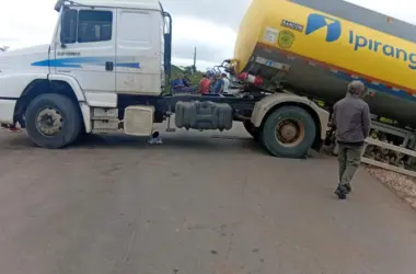 A BR-364, próximo ao Rio Liberdade, entre Cruzeiro do Sul e Tarauacá, segue fechada por uma carreta com combustível atravessada na estrada, devido a uma