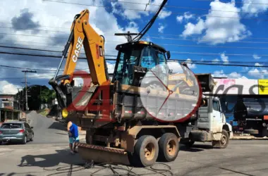 Um caminhão-caçamba que transportava um trator neste sábado, 20, acabou se enroscando na fiação elétrica e danificando cabos de internet na rua Rio Grande do