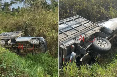 Os jovens Júnior Marciano e Railan Silva ficaram feridos na madrugada deste sábado (13), após a caminhonete em que estavam capotar no km 12 da