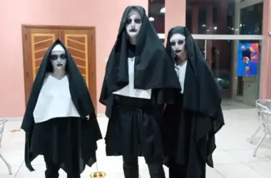 Três fãs roubaram a cena na noite de domingo (7) no Cine Romeu, em Cruzeiro do Sul, ao aparecerem fantasiados de freira para assistir à