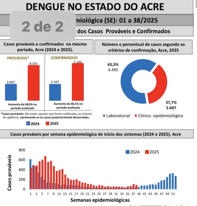 A Secretaria de Estado de Saúde do Acre (Sesacre) divulgou, com base em dados do Sinan Online atualizados até 23 de setembro de 2025, que o estado registrou crescimento expressivo no número de casos prováveis e confirmados de dengue em comparação com 2024.