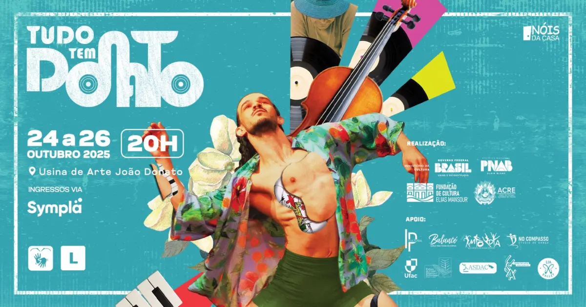 A obra do compositor acreano João Donato ganha novos contornos no espetáculo “Tudo Tem Donato”, que será apresentado de 24 a 26 de outubro, às 20h, na Usina de Arte João Donato, em Rio Branco (AC). A montagem convida o público a uma imersão sensorial e afetiva, traduzindo em movimento as cores, ritmos e memórias presentes na música do artista, reconhecido por sua genialidade e sutileza.