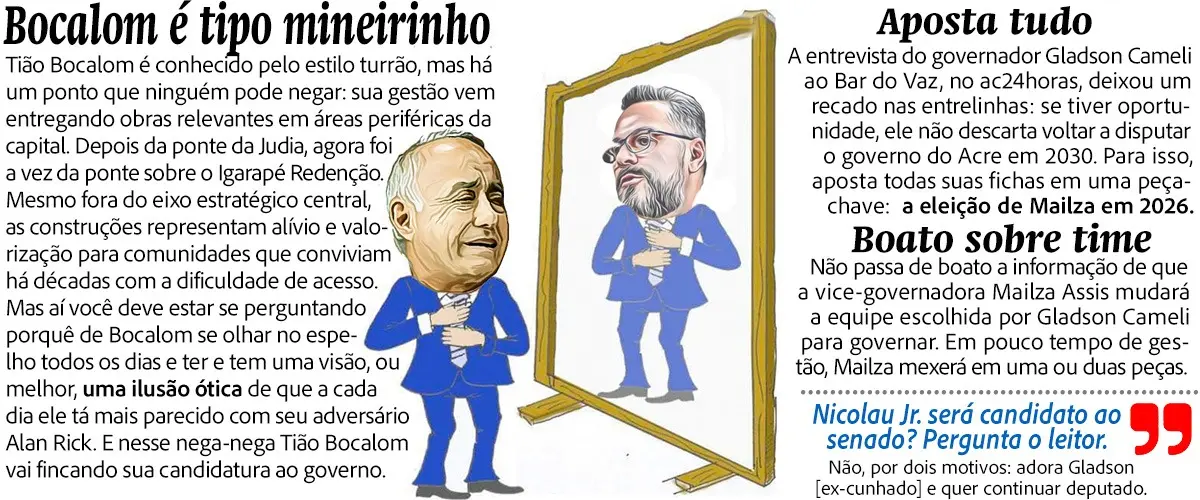 Lideranças regionais reforçam articulações em Brasília, buscando apoio político e recursos, enquanto no Acre cresce a pressão por renovação nas candidaturas. Bittar tenta firmar candidatura solo já de olho em decisão do STJ que prejudique os interesses políticos de Gladson. Seus aliados garantem que ele aguentará a pressão sobre quem apoiará para o governo até janeiro de 2026. Enquanto janeiro não vem, Bittar não abrirá fogo contra ninguém. Por enquanto só Jorge Viana, do PT, receberá os mísseis dele.