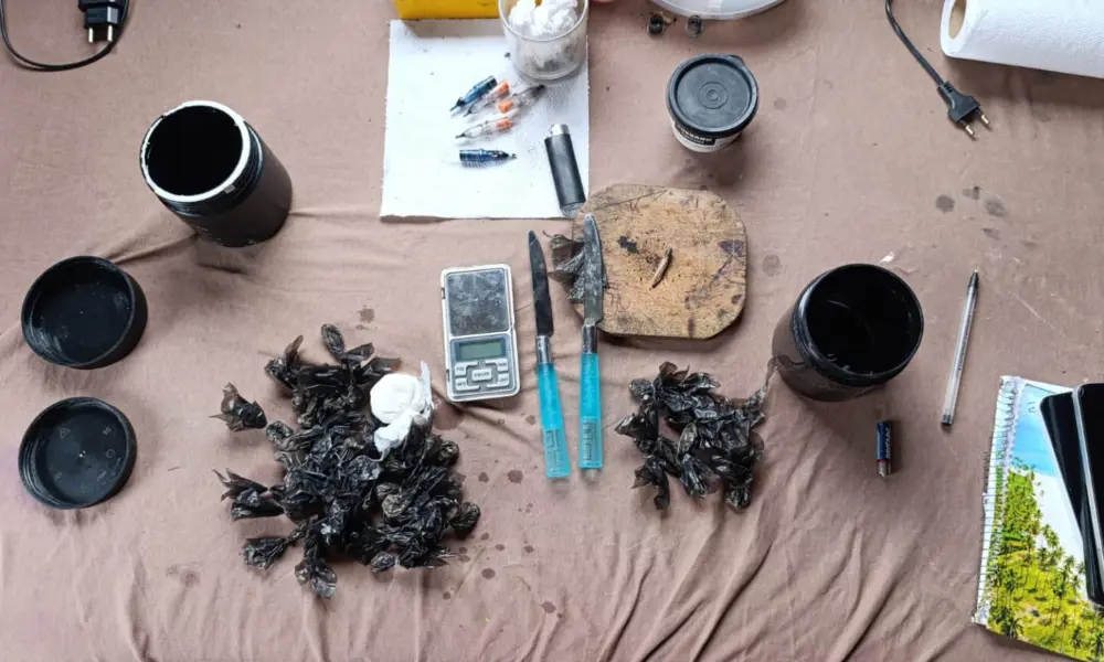 Também foram apreendidos um recipiente com entorpecente e 38 invólucros contendo substância aparentando ser oxidado de cocaína, embalados em sacos plásticos de cores preta e branca.