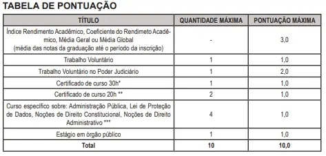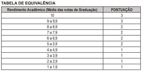 O processo seletivo simplificado ocorre em etapa única, por meio de análise curricular, de caráter classificatório e eliminatório. As candidatas e os candidatos serão ranqueados em ordem decrescente por meio do índice de coeficiente de rendimento acadêmico acima de 2 (dois), levando-se em consideração a seguinte tabela de pontuação: