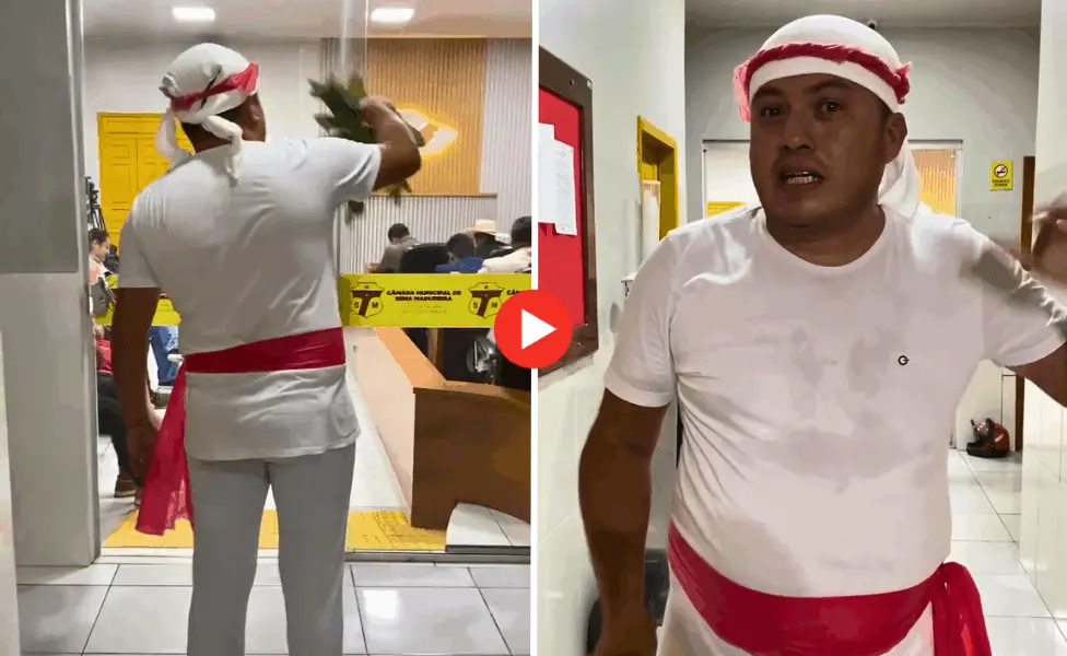 O humorista acreano Raynery Cunha, conhecido artisticamente como Pai Raynery, visitou a Câmara Municipal de Sena Madureira nesta terça-feira,14, em um ato simbólico e bem-humorado. Com vestes de pai de santo, com roupas nas cores branco e vermelho, ele entrou no plenário com o objetivo de “benzer” a Casa Legislativa, em alusão à briga física ocorrida na semana passada entre os vereadores Denis Araújo e Maycon Moreira.