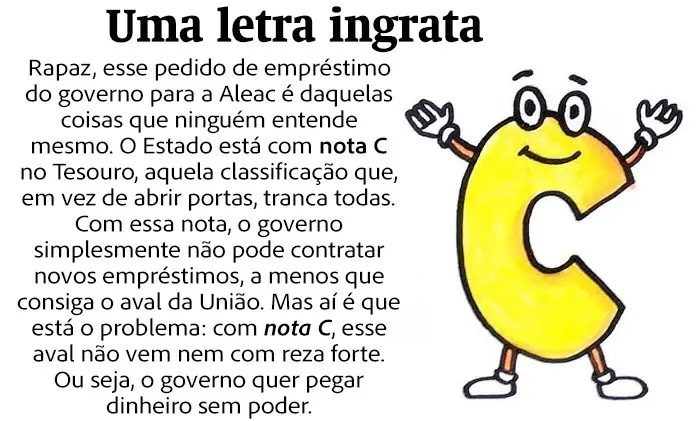 Sobre os empréstimos de R$ 280 milhões que o governo do Acre enviou pedido de autorização para a Assembleia Legislativa, o confronto entre narrativas é pesado. A oposição diz que as garantias são o FPE e o IPI, mas o governo diz que é exclusivamente o FPE. O fato é que o Estado continua com a letra C, perante o Tesouro Nacional.