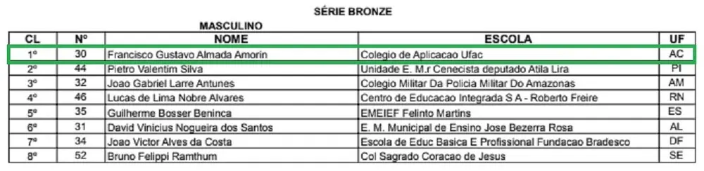 Além de Gustavo, o Acre também foi representado na disputa feminina por Larissa Suellen, estudante da escola Professor Pedro de Castro Meireles, do município de Acrelândia. A atleta ficou em quinto lugar na prova de velocidade (200 metros).
