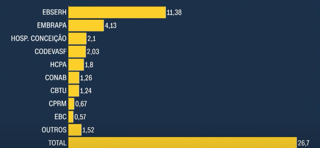 Entre as empresas que mais receberam recursos do Tesouro Nacional, destaca-se a Ebserh (Empresa Brasileira de Serviços Hospitalares), vinculada ao Ministério da Educação e responsável pela gestão dos hospitais federais, que recebeu aproximadamente R$ 11,5 bilhões.