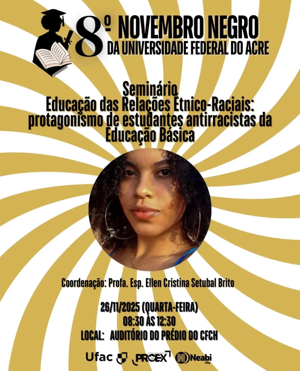 Como parte da programação do 8º Novembro Negro, acontece em 26 de novembro, das 8h30 às 12h30, o Seminário “Educação das Relações Étnico-Raciais: protagonismo de estudantes antirracistas da Educação Básica”, no campus da Universidade Federal do Acre (Ufac).
