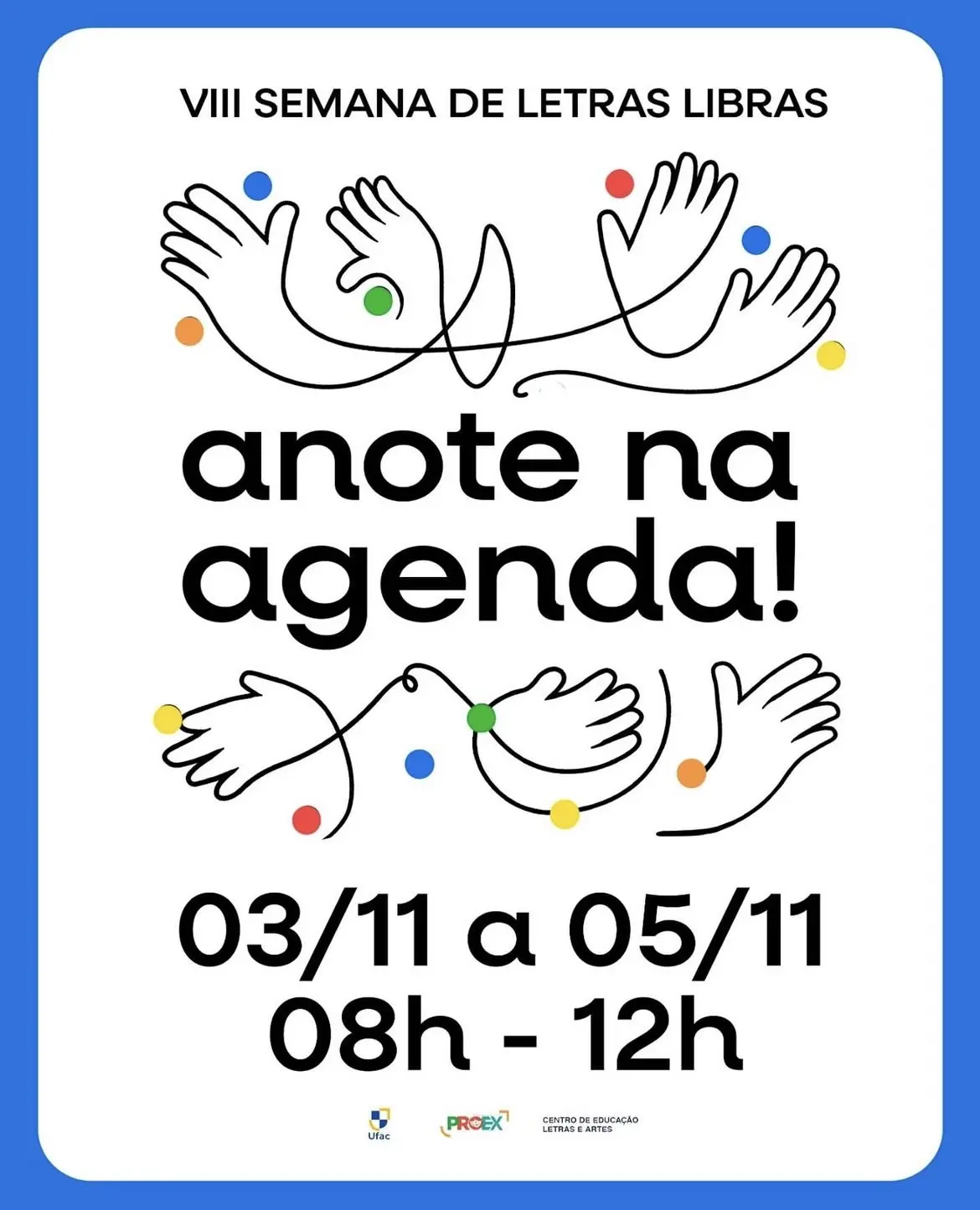 De 3 a 5 de novembro, das 8h às 12h, o Anfiteatro Garibald Brasil e o Bloco Multidisciplinar do Cela recebem a VII Semana de Letras Libras, evento que promove reflexões sobre a cultura surda, a identidade linguística e os desafios do ensino inclusivo.