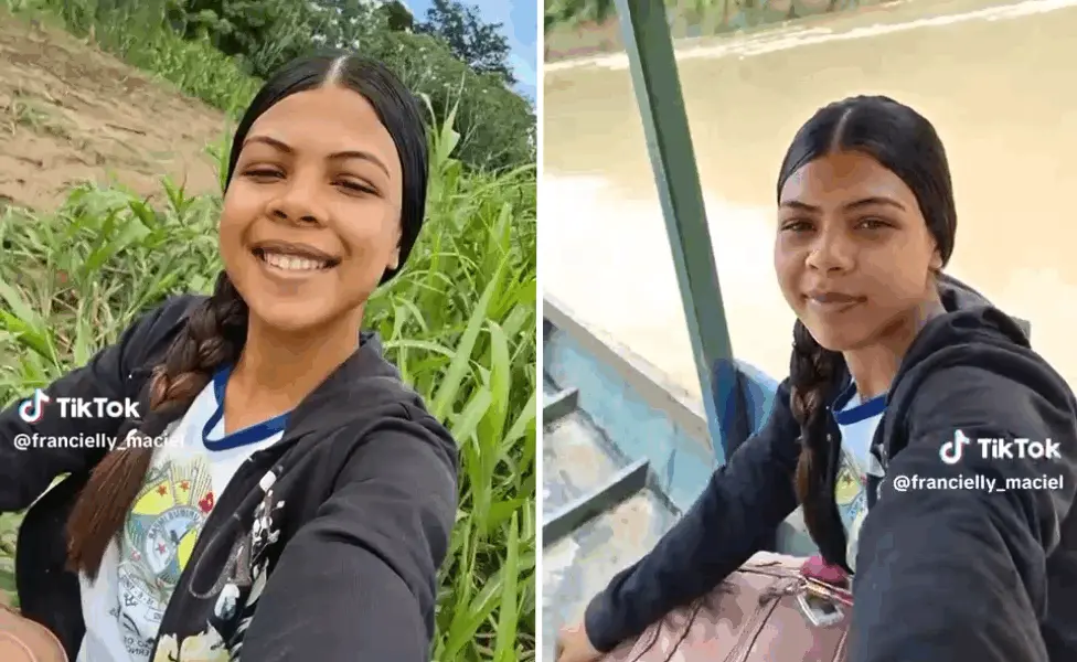 Em tom leve, Francielly convida o público a acompanhá-la na viagem até a escola. Ela usou o Rio Iaco, que banha a cidade de Sena Madureira. “Vamos me acompanhar indo pra escola, sendo uma ribeirinha e morando no interior do Acre, gente. O rio, o rio estava desse jeito. Esse daí, gente, é chamado de rio Iaco. O rio que nos dá acesso pra ir pra escola e também pra ir pro município de Sena Madureira, quando está no inverno”, contou.