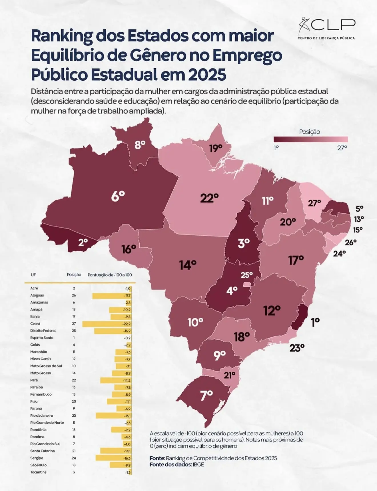 O Acre ocupa a segunda posição no ranking nacional de Equilíbrio de Gênero no Emprego Público Estadual 2025, elaborado pelo Centro de Liderança Pública (CLP). O levantamento avalia a presença feminina em cargos da administração pública estadual — excetuando as áreas de saúde e educação — em comparação com o cenário ideal de paridade na força de trabalho.