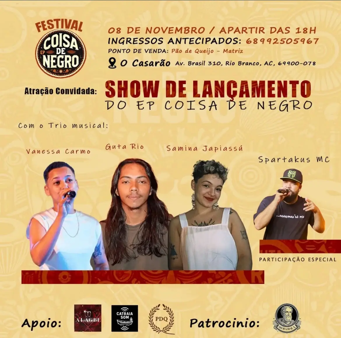 A música e a ancestralidade vão tomar conta de O Casarão, em Rio Branco, no próximo sábado (8 de novembro), a partir das 18h, com o Festival Coisa de Negro. O evento marca o lançamento do EP “Coisa de Negro” e traz um repertório vibrante que celebra a força e a diversidade dos ritmos afro-brasileiros.