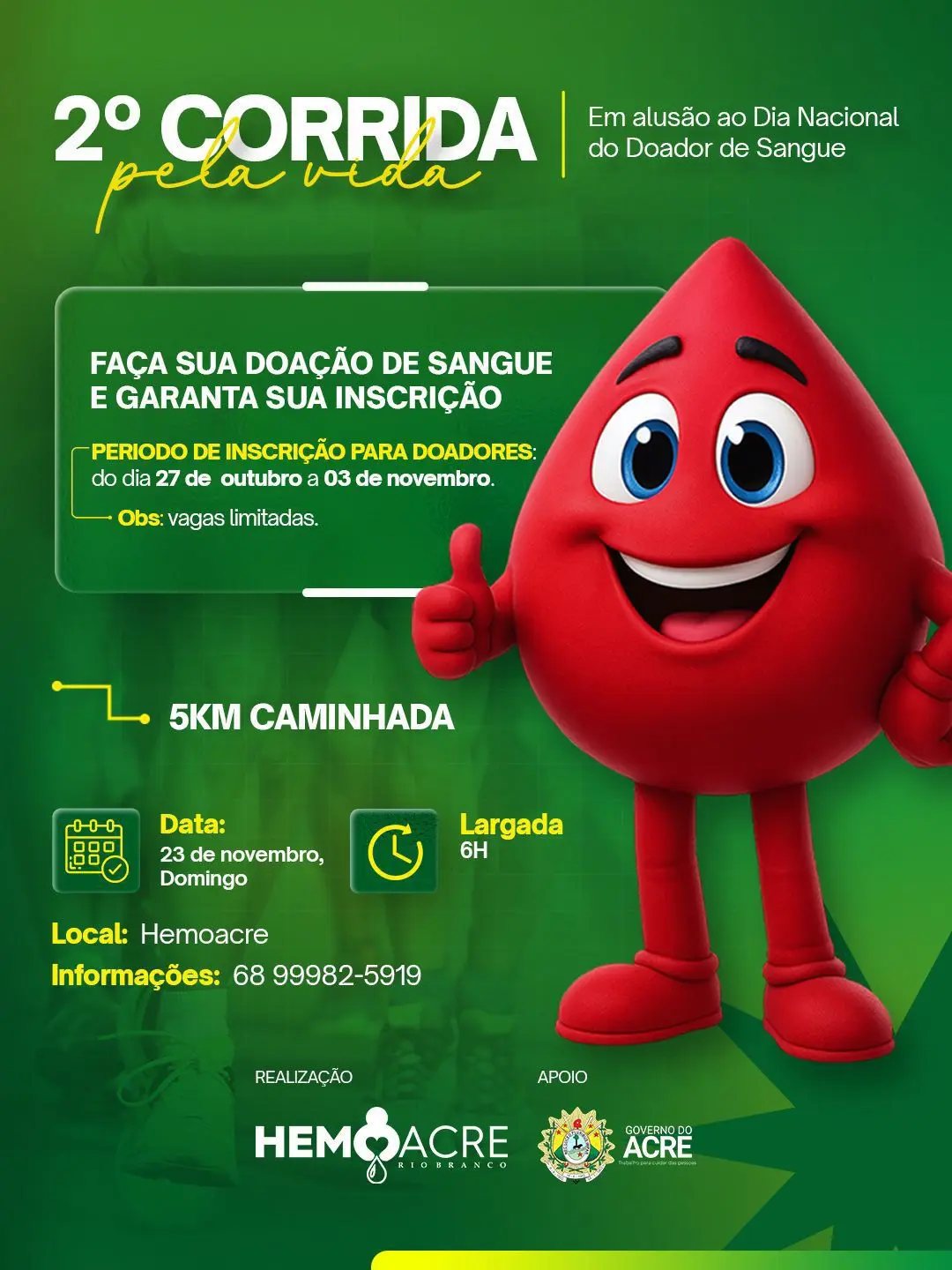 O Centro de Hematologia e Hemoterapia do Acre (Hemoacre) abriu nesta segunda-feira, 27, as inscrições para a 2ª Corrida “Pela Vida”, que será realizada no dia 23 de novembro de 2025, em Rio Branco.