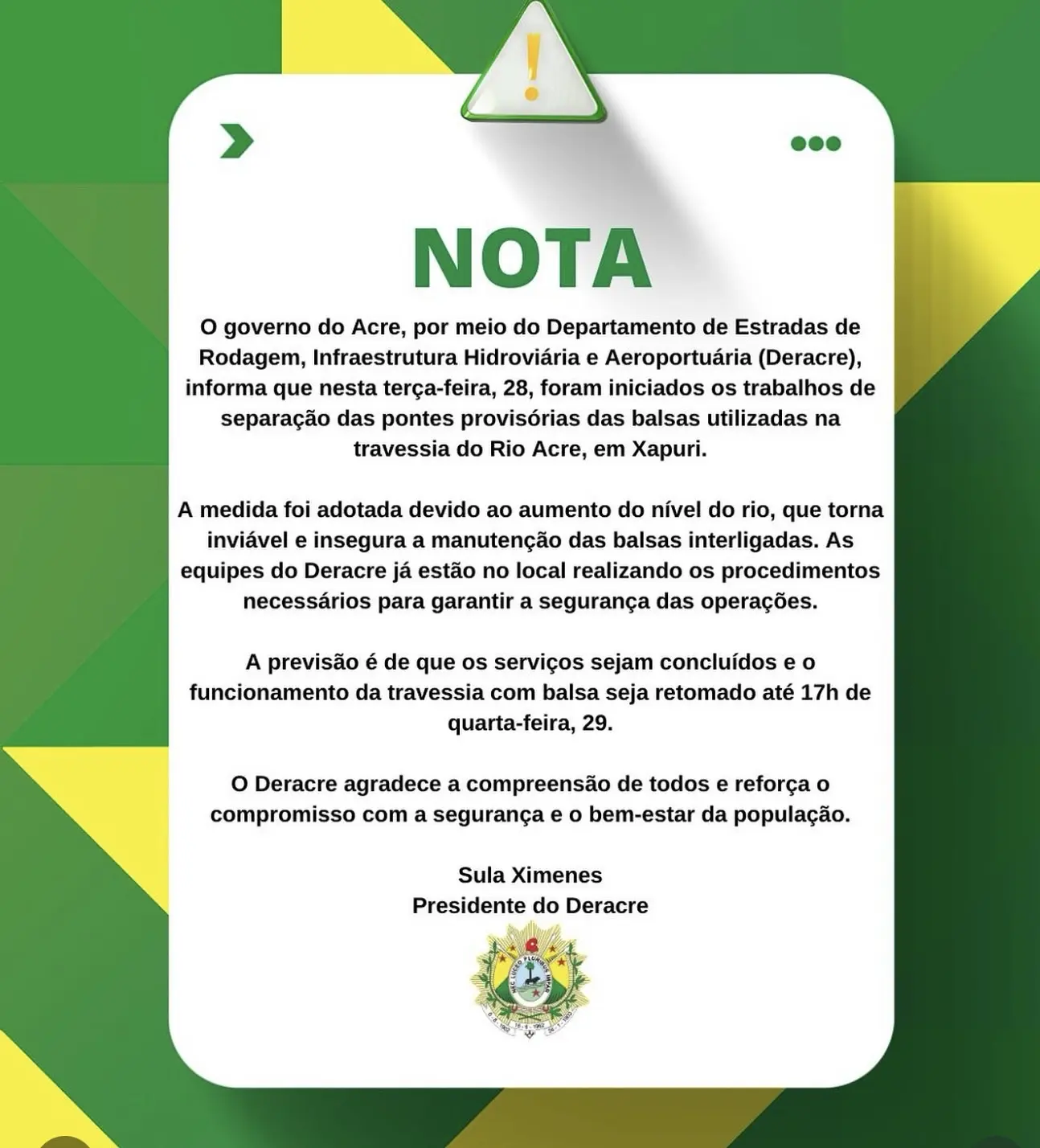 O governo do Acre, por meio do Departamento de Estradas de Rodagem, Infraestrutura Hidroviária e Aeroportuária (Deracre), iniciou nesta terça-feira (28) os trabalhos de separação das pontes provisórias das balsas utilizadas na travessia do Rio Acre, em Xapuri. A nota é assinada por Sula Ximenes, presidente do órgão.