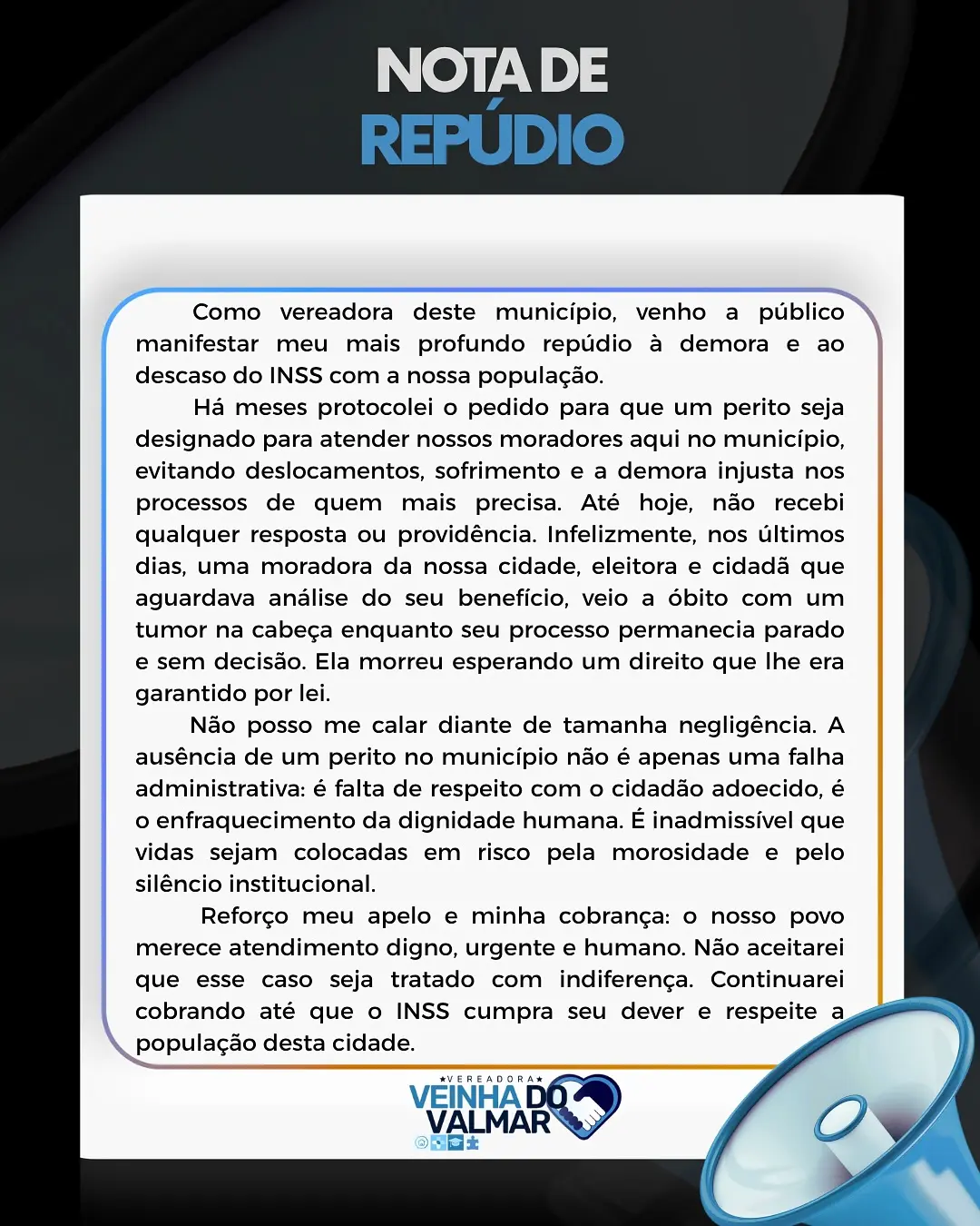 “Como vereadora deste município, venho a público manifestar meu mais profundo repúdio à demora e ao descaso do INSS com a nossa população. Há meses protocolei o pedido para que um perito seja designado para atender nossos moradores aqui, evitando deslocamentos, sofrimento e demora injusta. Até hoje, não recebi qualquer resposta ou providência”, declarou. “Infelizmente, uma moradora da nossa cidade morreu esperando um direito que lhe era garantido por lei. A ausência de um perito não é apenas uma falha administrativa, é falta de respeito com o cidadão adoecido. É inadmissível que vidas sejam colocadas em risco pela morosidade e pelo silêncio institucional. O nosso povo merece atendimento digno, urgente e humano”, finalizou a parlamentar.