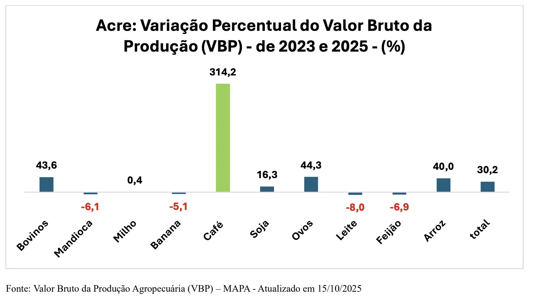 Entre 2023 e 2025, o VBP do café saltou de R$ 33,7 milhões para R$ 139,6 milhões, um aumento de 314,2%, o maior entre todos os produtos analisados. Com esse avanço, o café passou a ocupar a quinta posição no ranking estadual e superou a soja, que registrou VBP de R$ 123,6 milhões e crescimento bem mais modesto (16,3%). No gráfico a seguir, constam as variações dos principais produtos agropecuários do Acre.