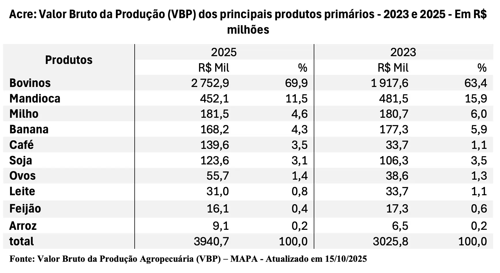 Os dados atualizados do Ministério da Agricultura (MAPA) mostram que o Valor Bruto da Produção (VBP) agropecuária do Acre deve atingir R$ 3,94 bilhões em 2025, um crescimento expressivo de 30,2% em relação a 2023, conforme pode ser observado na tabela a seguir. O desempenho é impulsionado principalmente pela pecuária bovina, que continua sendo o carro-chefe da economia rural acreana, respondendo por quase 70% de todo o VBP estadual. No entanto, o dado mais emblemático do período é a impressionante expansão da cafeicultura.