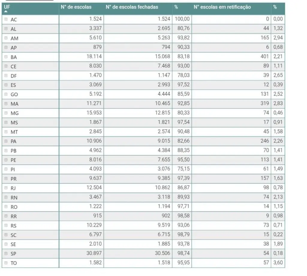 De acordo com os painéis oficiais do MEC, o Acre finalizou as declarações de todas as unidades escolares, sem pendências de retificação, alcançando desempenho superior à média nacional, que ficou em 90,14%. Estados como Amazonas, Roraima e São Paulo também obtiveram índices elevados, mas nenhum conseguiu atingir a totalidade das escolas dentro do prazo.