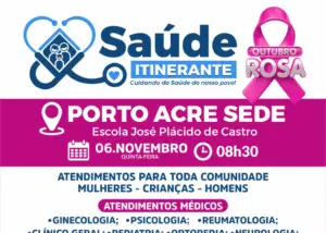 A população de Porto Acre receberá, nesta quinta-feira, 6, uma edição do programa Saúde Itinerante, uma ação promovida pela Prefeitura de Porto Acre, por meio