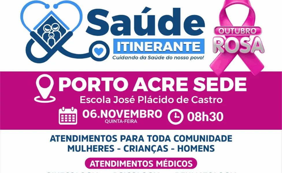 A população de Porto Acre receberá, nesta quinta-feira, 6, uma edição do programa Saúde Itinerante, uma ação promovida pela Prefeitura de Porto Acre, por meio da Secretaria Municipal de Saúde (Semsa), em parceria com o Instituto Cuidar Mais. O atendimento será realizado a partir das 8h30, na Escola José Plácido de Castro, localizada na sede do município.