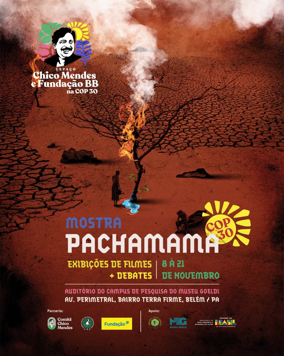 Terá início no sábado, 8, a Mostra de Cinema Pachamama na COP 30, dentro da programação do Espaço Chico Mendes & Fundação Banco do Brasil, localizado no campus do Instituto Emílio Goeldi, no bairro Terra Firme. A mostra, que segue até o dia 21, reúne 18 filmes que refletem sobre meio ambiente, cultura, resistência, tradição, territórios e identidades, promovendo o diálogo entre arte, memória e os desafios contemporâneos da Amazônia e do planeta.