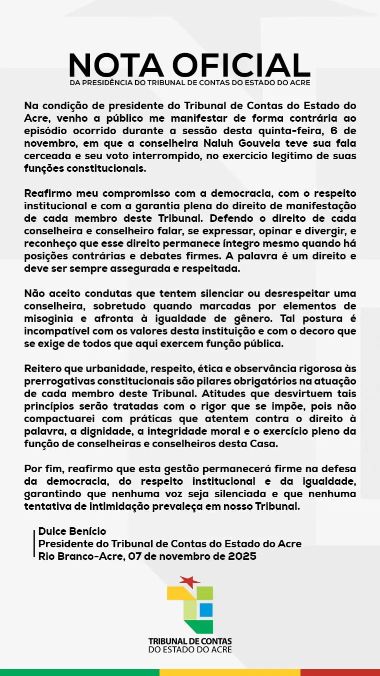 “Venho a público me manifestar de forma contrária ao episódio ocorrido durante a sessão desta quinta-feira, 6 de novembro, em que a conselheira Naluh Gouveia teve sua fala cerceada e seu voto interrompido, no exercício legítimo de suas funções constitucionais”, afirmou a presidente.