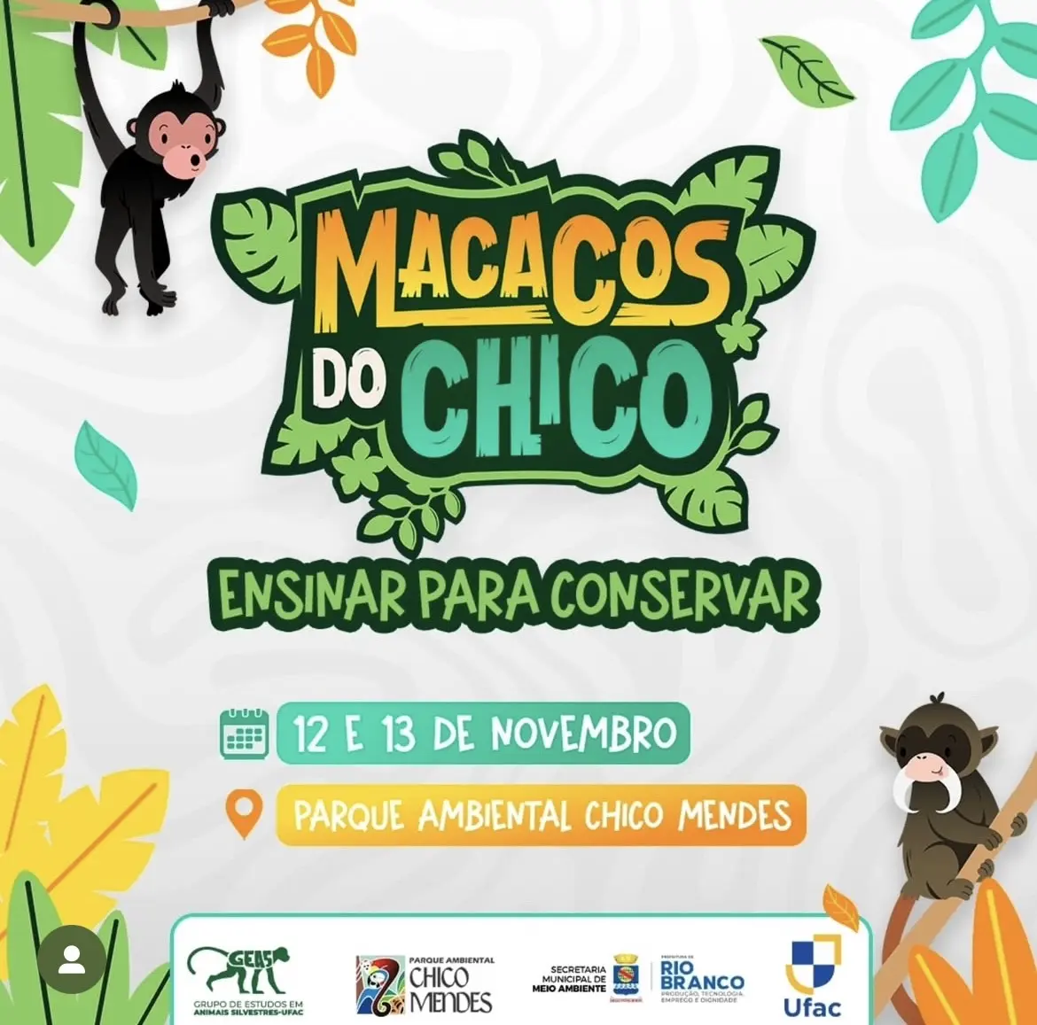 Nos dias 12 e 13 de novembro, o Parque Ambiental Chico Mendes, em Rio Branco, vai se transformar em uma grande sala de aula a céu aberto. A programação inclui teatro, jogos ambientais e visitas orientadas ao zoológico, com o tema “Macacos do Chico: ensinar para conservar”.