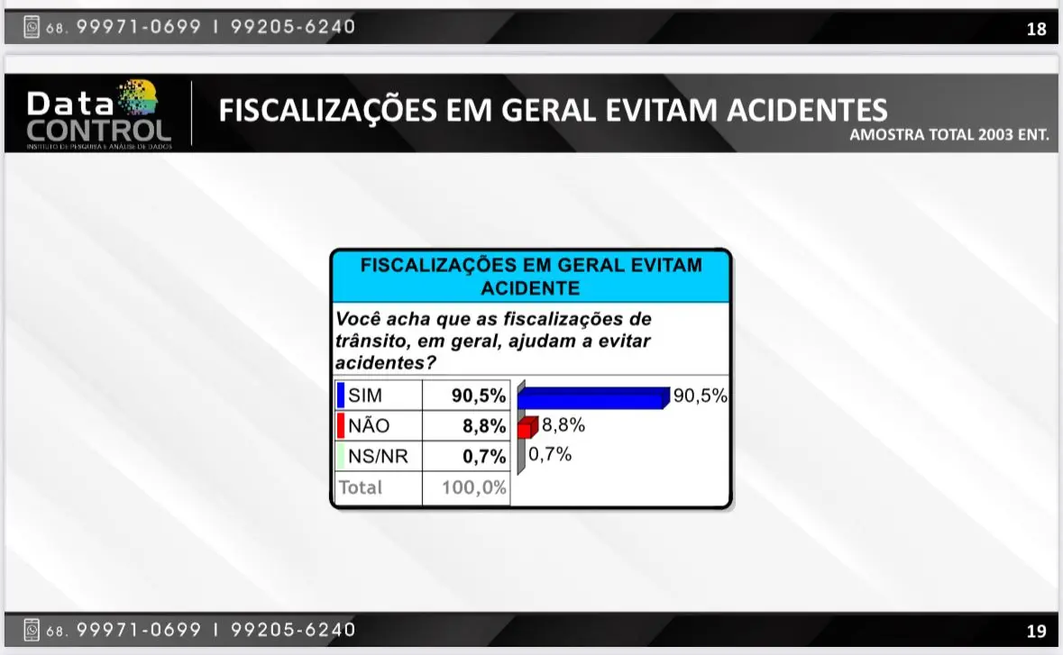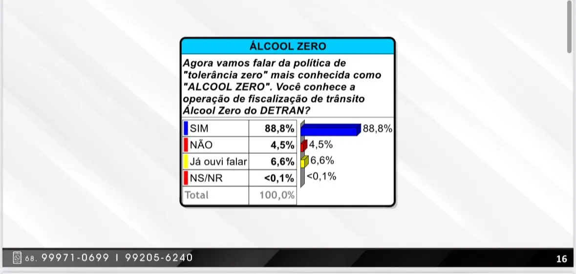 O tema é polêmico e com o resultado da pesquisa, o Detran observa o apoio da população e entendimento com a operação do trânsito para evitar os acidentes. “O Álcool Zero ocorre há mais de 20 anos e nós dobramos as operações. Quando a Taynara chegou aqui, nós dobramos o tempo de operação com a Polícia Militar para evitar os casos de acidente de trânsito que estavam muito altos”, afirma o Diretor de Operações.