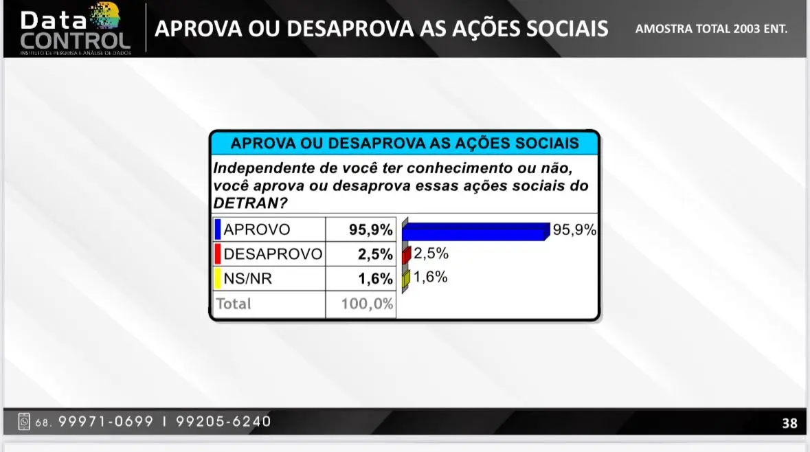 Para atestar o desempenho do serviço realizado nos últimos anos e saber como a população avalia o órgão, uma pesquisa junto ao Instituto Data Control acaba de revelar um dado expressivo: aprovação de 95,9% dos entrevistados sobre as ações sociais desenvolvidas pelo Detran no Acre.