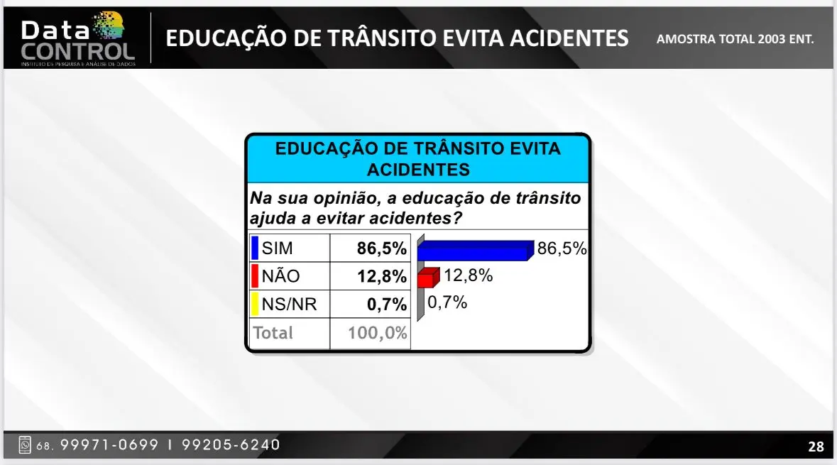 A pesquisa mostra ainda que 96,5% da população aprova a fiscalização da lei Álcool Zero e que 90,5% da população apoia as demais operações de trânsito que contribuem para evitar os acidentes de trânsito. “Pode parecer pouco, mas é um trabalho que tem que começar dentro de casa”, diz Martins.