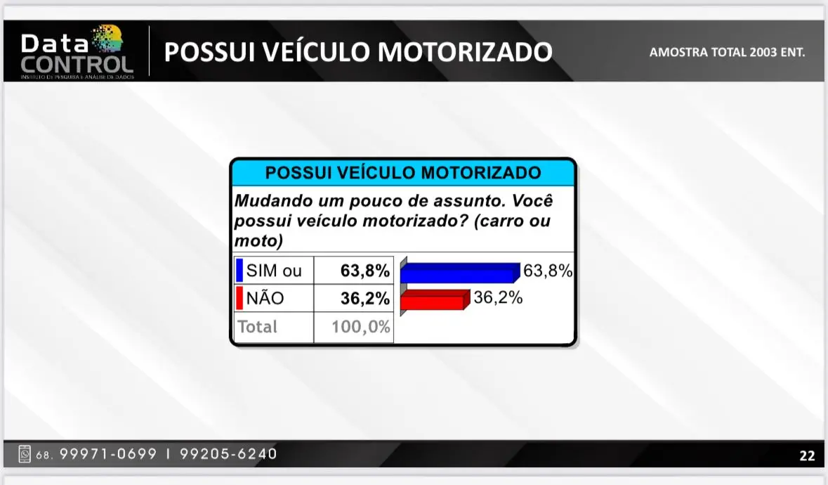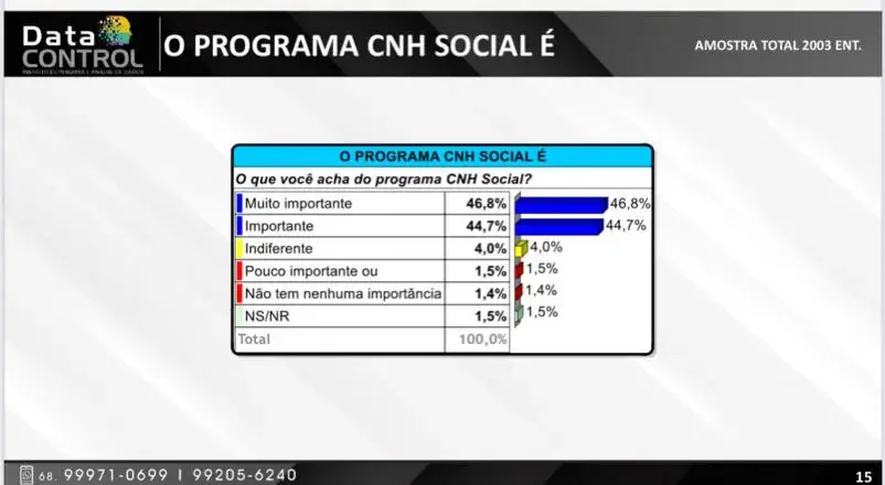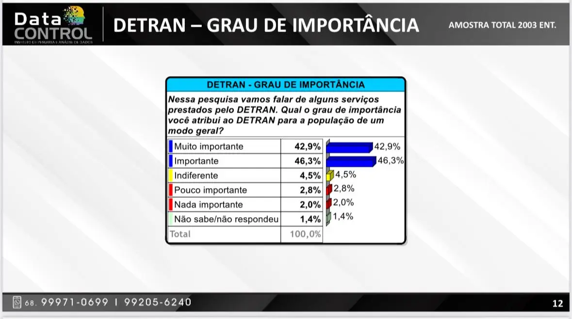 89,2% dos entrevistados consideram o Detran no Acre como importante ou muito importante. A pesquisa realizada pelo Data Control com a população, visando obter informações sobre o Detran/AC, ouviu 2,3 mil pessoas, entre 18 e 26 de outubro de 2025, em Rio Branco, Cruzeiro do Sul e Brasileia. A margem de erro é de: 2,20% para mais ou para menos, com intervalo de confiança de 95%.