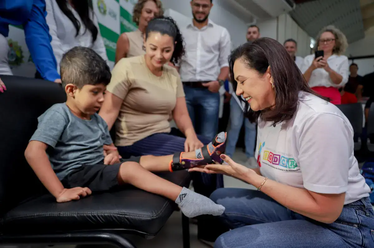 Elciane Fernandes, mãe de Elias, afirma que as órteses vão auxiliar a criança no tratamento: “Vai melhorar muito, porque vai ajudar a manter o pé dele no lugar, para não entortar e atrofiar mais”.