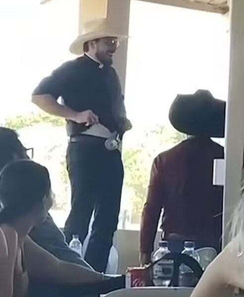 No vídeo, o padre aparece de chapéu de boiadeiro e camisa com clérgima, subindo em uma cadeira enquanto puxa o cós da cueca. O leiloeiro chega a anunciar lances que chegam a R$ 3 mil.