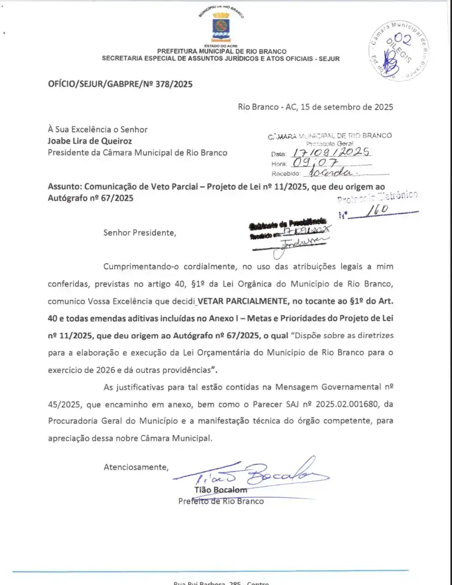 A Prefeitura de Rio Branco enviou à Câmara Municipal o Veto Parcial nº 16/2025, referente ao Projeto de Lei Complementar nº 11/2025, que estabelece as Diretrizes para a Elaboração e Execução da Lei Orçamentária (LDO) de 2026. O documento obtidos pelo ac24horas foi encaminhado pelo prefeito Tião Bocalom, por meio do Ofício nº 378/2025 da Secretaria Especial de Assuntos Jurídicos (Sejur), e inclui a Mensagem Governamental nº 45/2025, com as justificativas do veto.