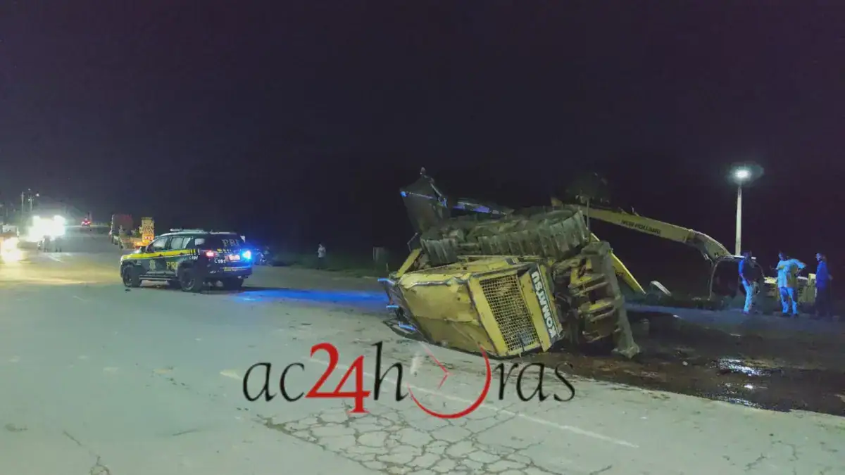 Um trator de esteira caiu de uma carreta prancha e deixou a BR-364 parcialmente interditada na noite desta quarta-feira (12). O acidente ocorreu na Via Verde, nas proximidades da 3ª Ponte, em Rio Branco.