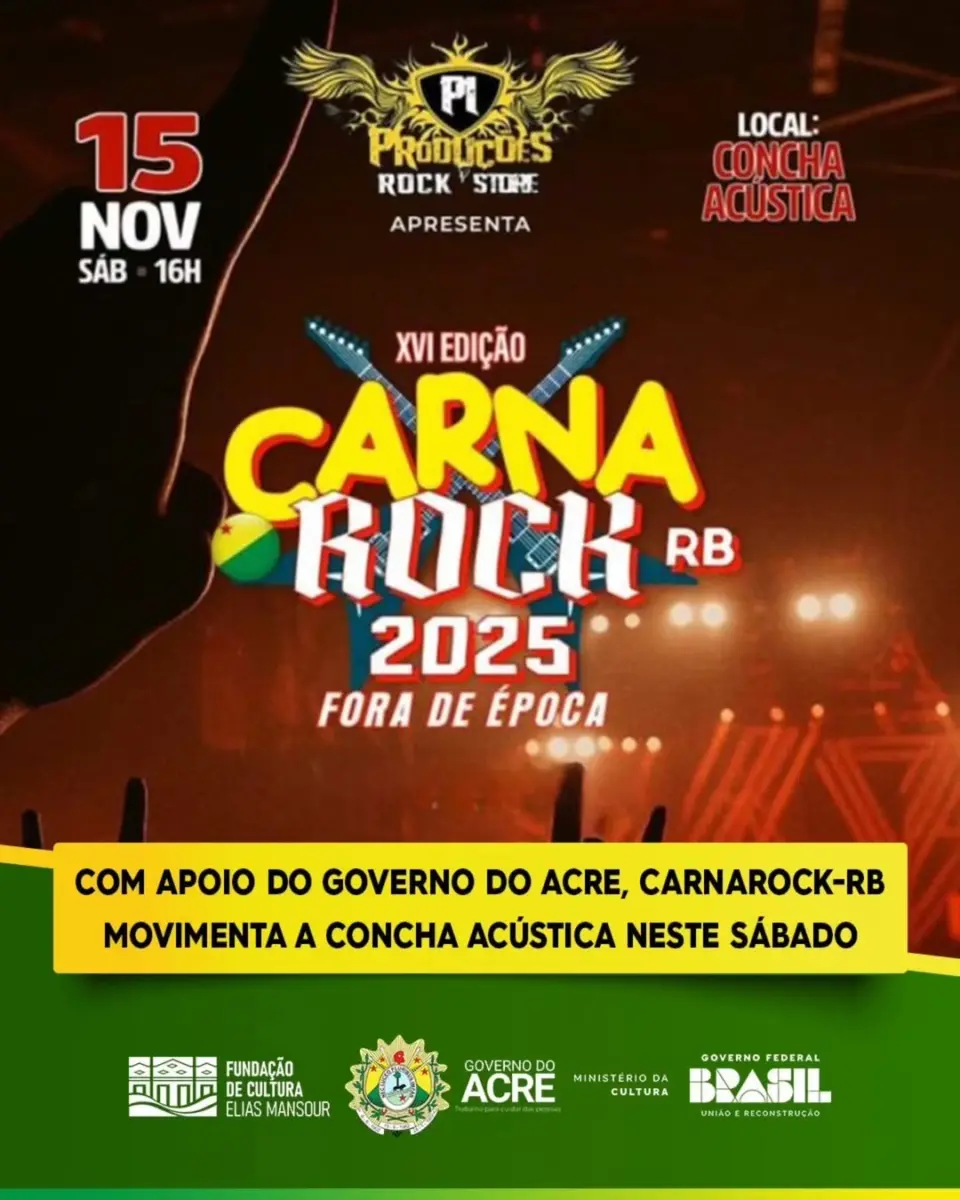 A Concha Acústica de Rio Branco recebe, neste sábado, 15, a 16ª edição do Carnarock-RB, um dos eventos mais tradicionais dedicados ao rock acreano. A programação começa às 16 horas e promete reunir fãs do gênero em uma grande celebração musical.