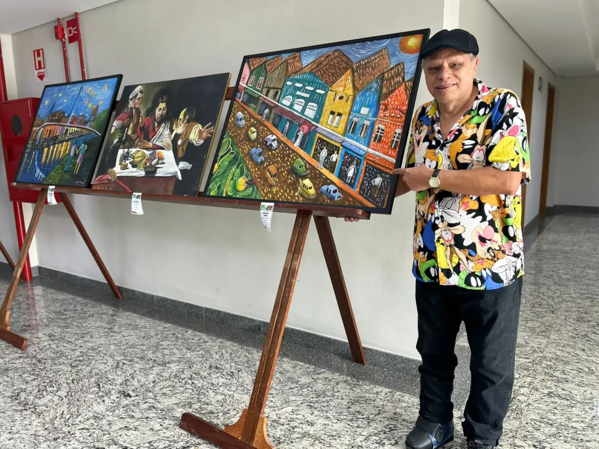 O artista explicou que esta é a segunda versão da mostra, após a primeira ter sido apresentada no Tribunal de Contas do Estado (TCE). “Bom dia a todos. Essa minha exposição retrata a Amazônia e o Acre. Eu já fiz a segunda versão aqui no Seplan, a primeira foi lá no TCE, Tribunal de Contas do Estado, aí me convidaram para me fazer aqui no TCE. São releituras de artistas famosos como Van Gogh. Tem Reflexão, tem um quadro de Jesus Cristo, tem muita versão aqui. Aí eu militei na imprensa acreana durante anos, como chargista e como diagramador. Agora eu estou me dedicando às artes plásticas”, contou DIM.